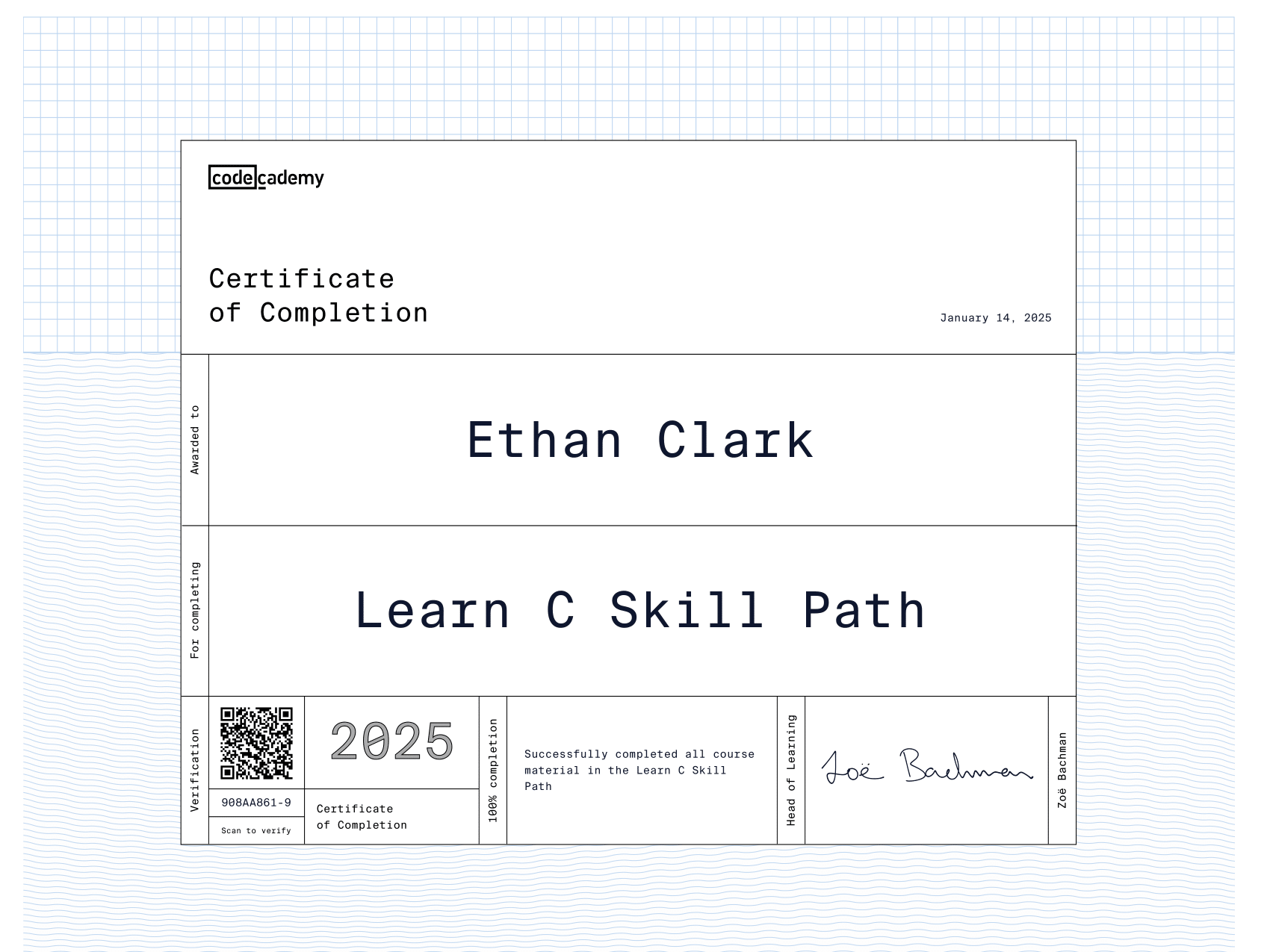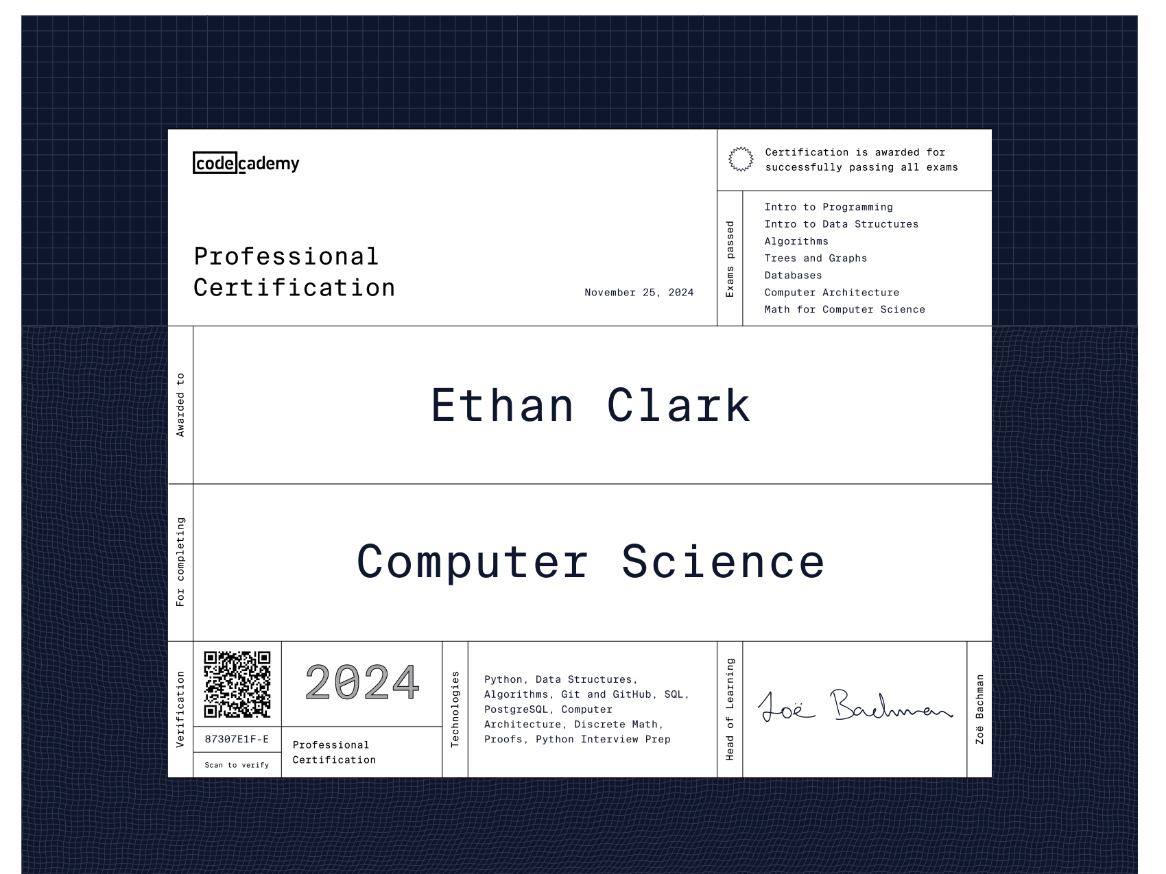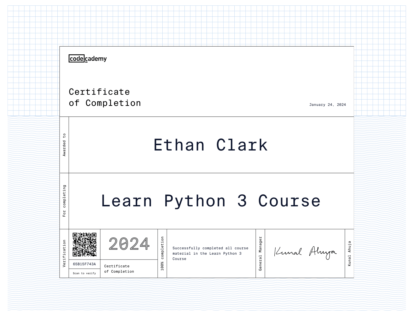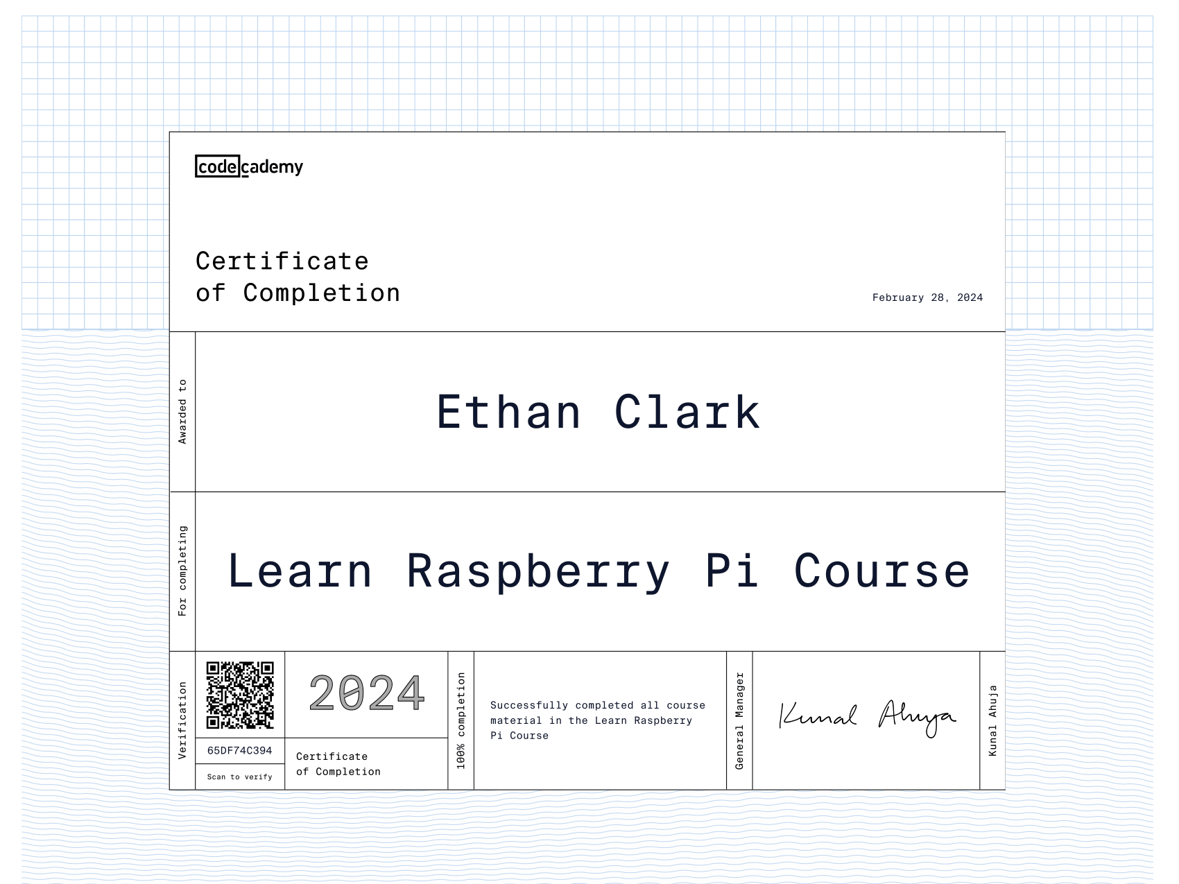 I am currently learning many topics on Codecademy including Data Analytics, Artificial Intelligence, Computer Science, Python, Java, C++, HTML & CSS, and much more. In fact, I learned how to make this very website using Codecademy!